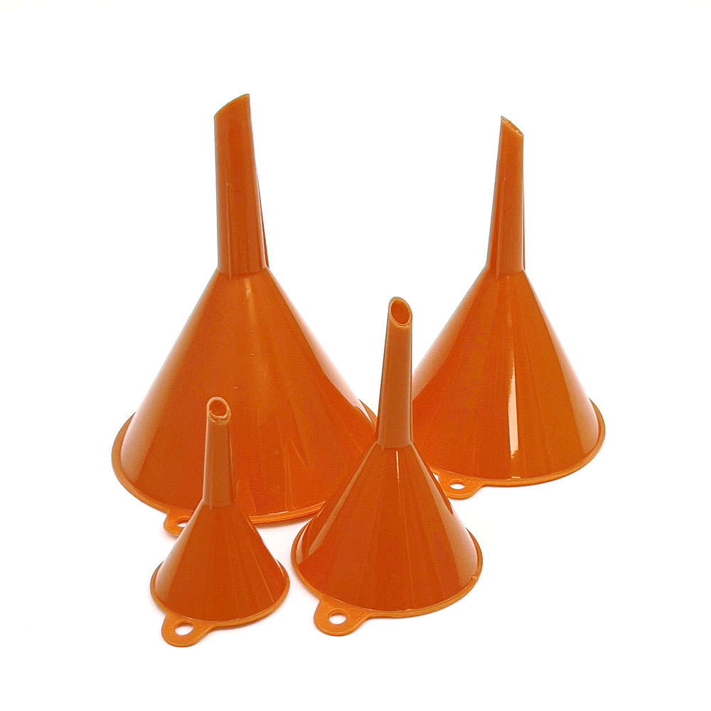 Heavy duty polyethylene (HDPE) funnel set in orange colour. The funnels each have an attachment for hanging.